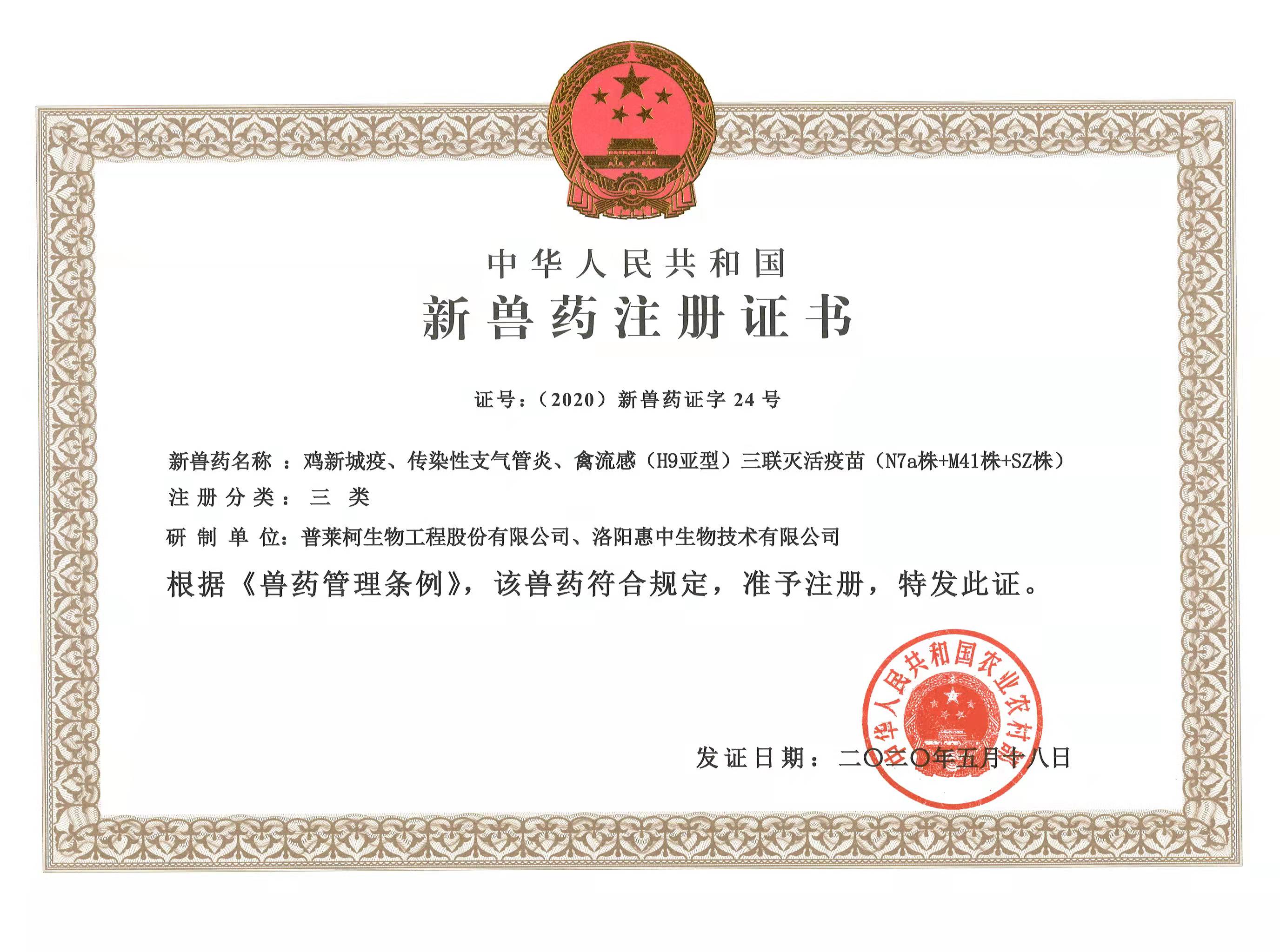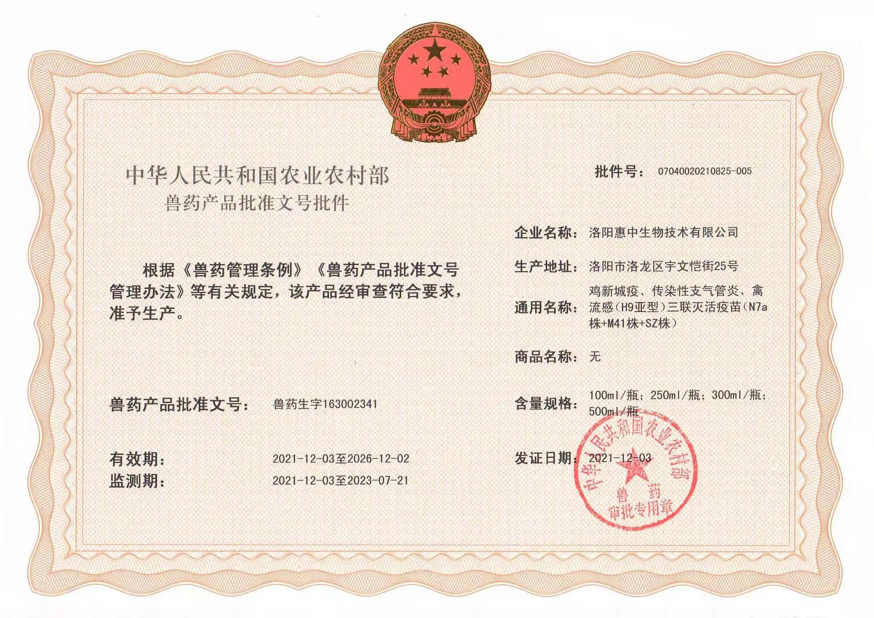 洛陽惠中生物技術(shù)有限公司繼2020年取得“雞新城疫、傳染性支氣管炎、禽流感(H9亞型)三聯(lián)滅活疫苗(N7a株+M41株+SZ株)”的新獸藥注冊證書后,再次取得了中華人民共和國農(nóng)業(yè)農(nóng)村部獸藥產(chǎn)品批準文號批件,產(chǎn)品符合《獸藥管理條例》、《獸藥產(chǎn)品批準文號管理辦法》等規(guī)定。