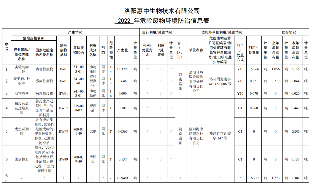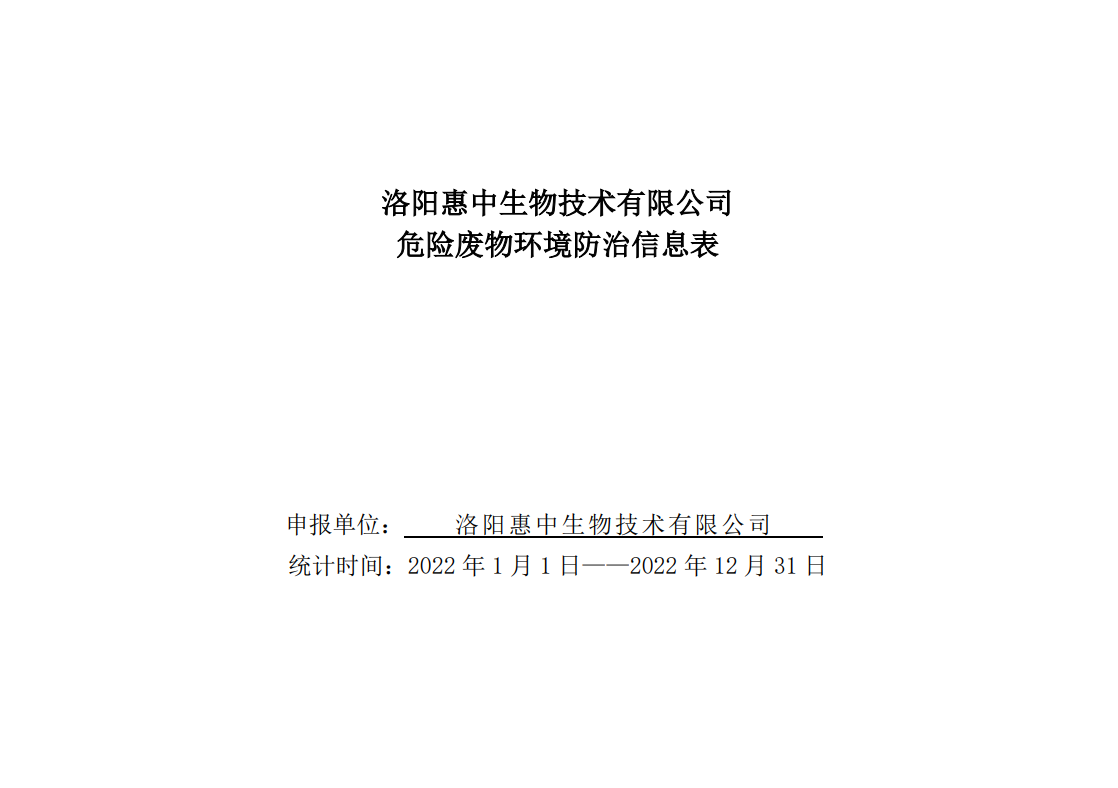 洛陽(yáng)惠中生物技術(shù)有限公司 危險(xiǎn)廢物環(huán)境防治信息表